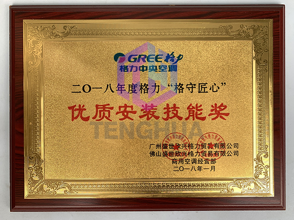 珠海格力電器股份有限公司頒發(fā)2018年度“格守匠心”優(yōu)質(zhì)安裝技能獎(jiǎng)授予廣州市騰華制冷設(shè)備有限公司。