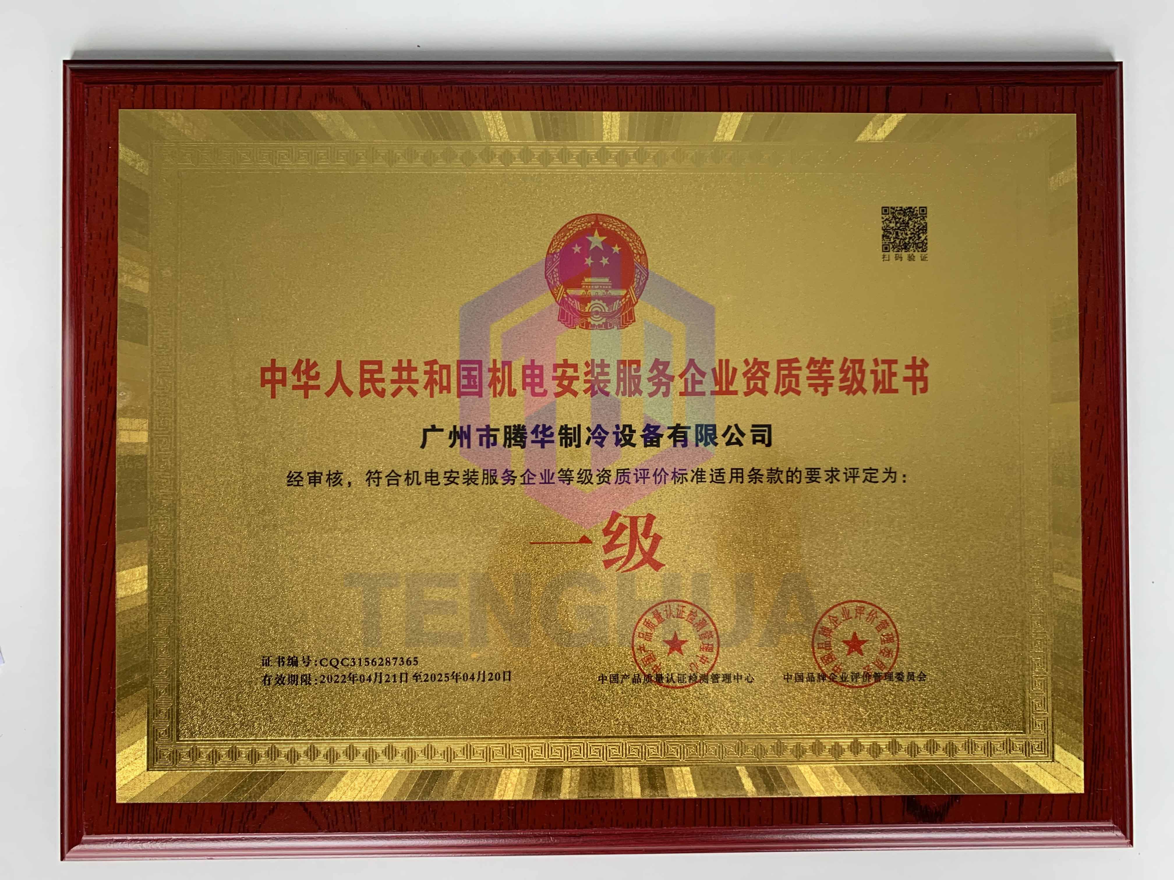 經審核,廣州市騰華制冷設備有限公司符合機電安裝服務企業等級資質評價標準使用條款的要求,評定為我國機電安裝服務企業資質等級“一級”并獲得該證書資質。